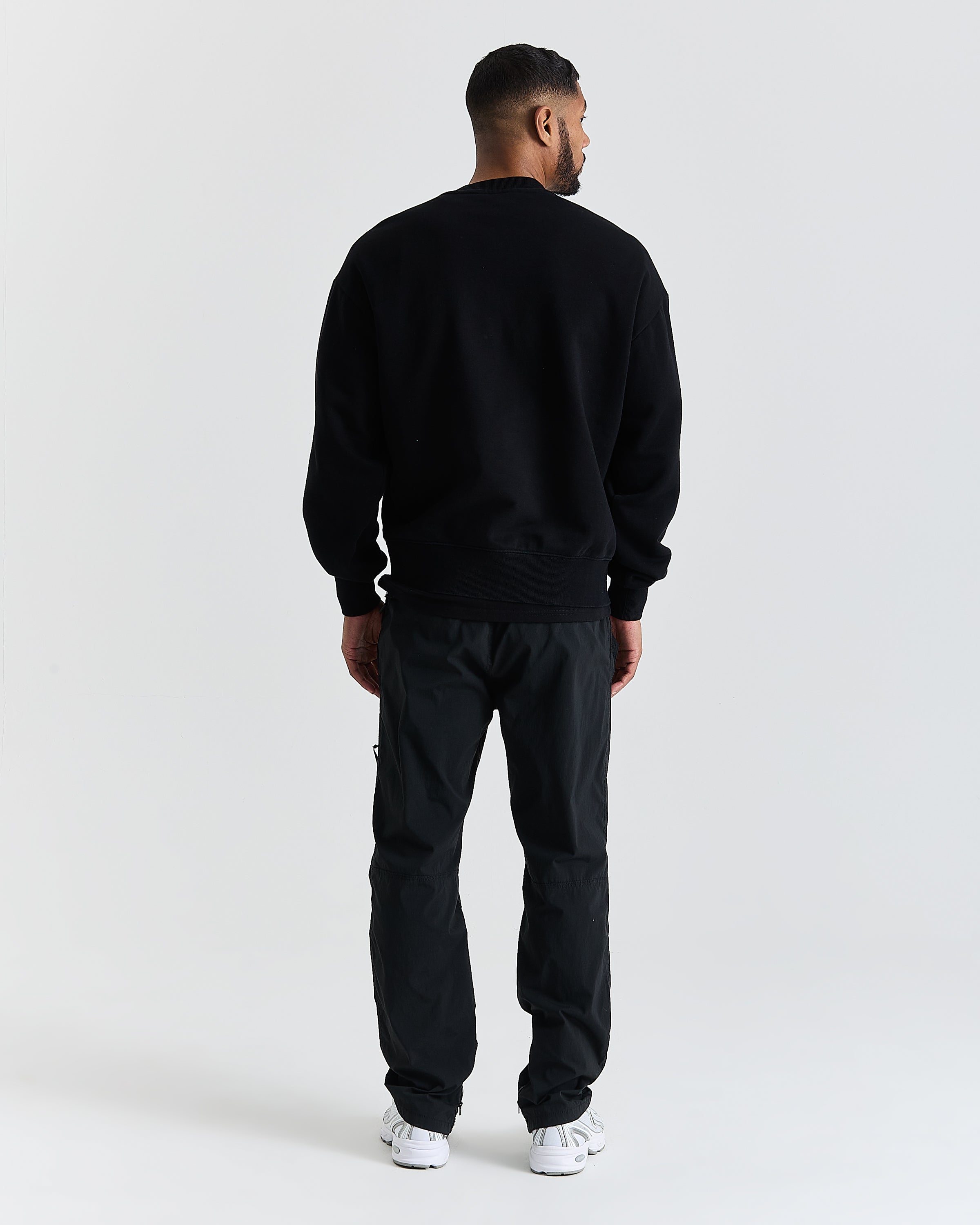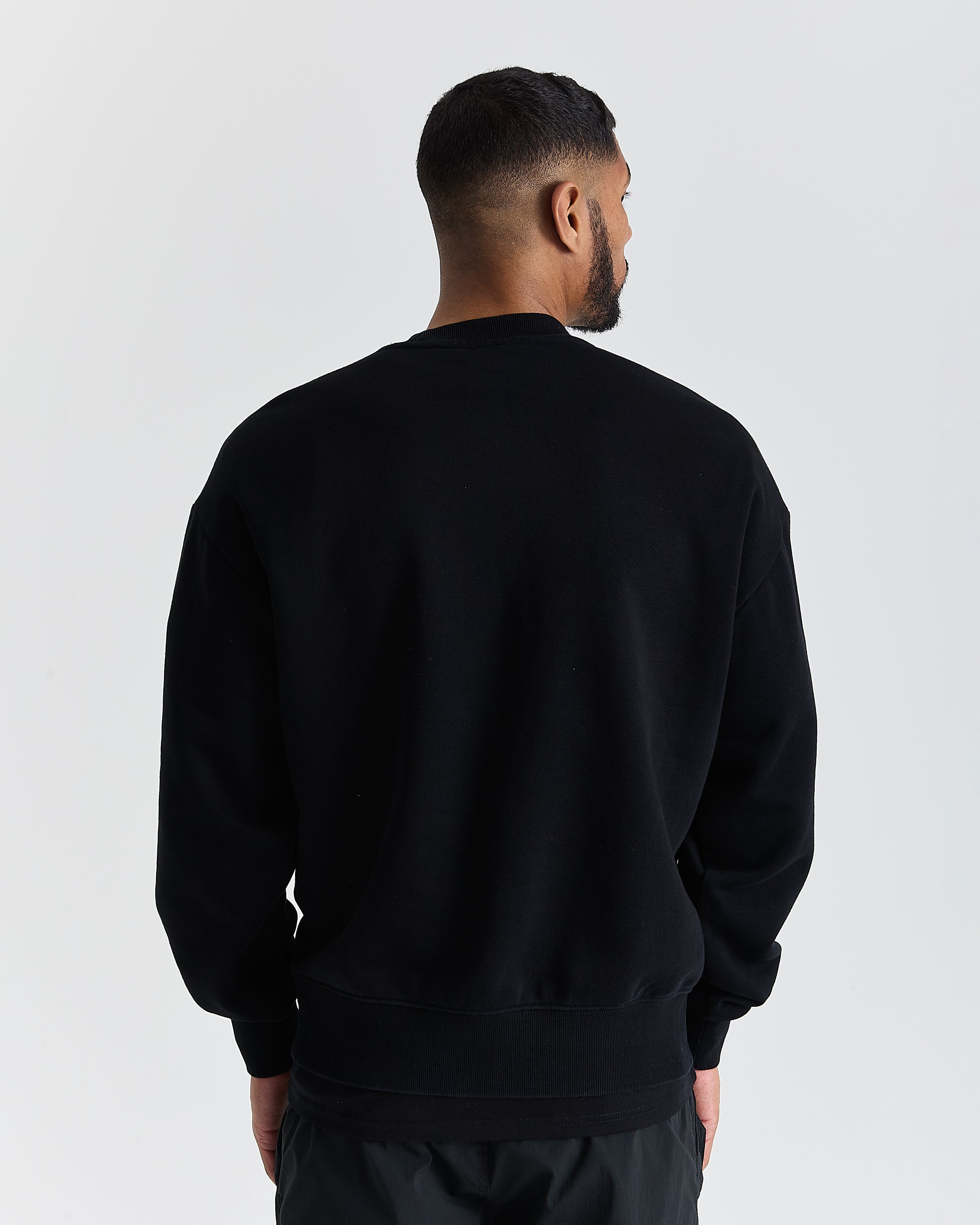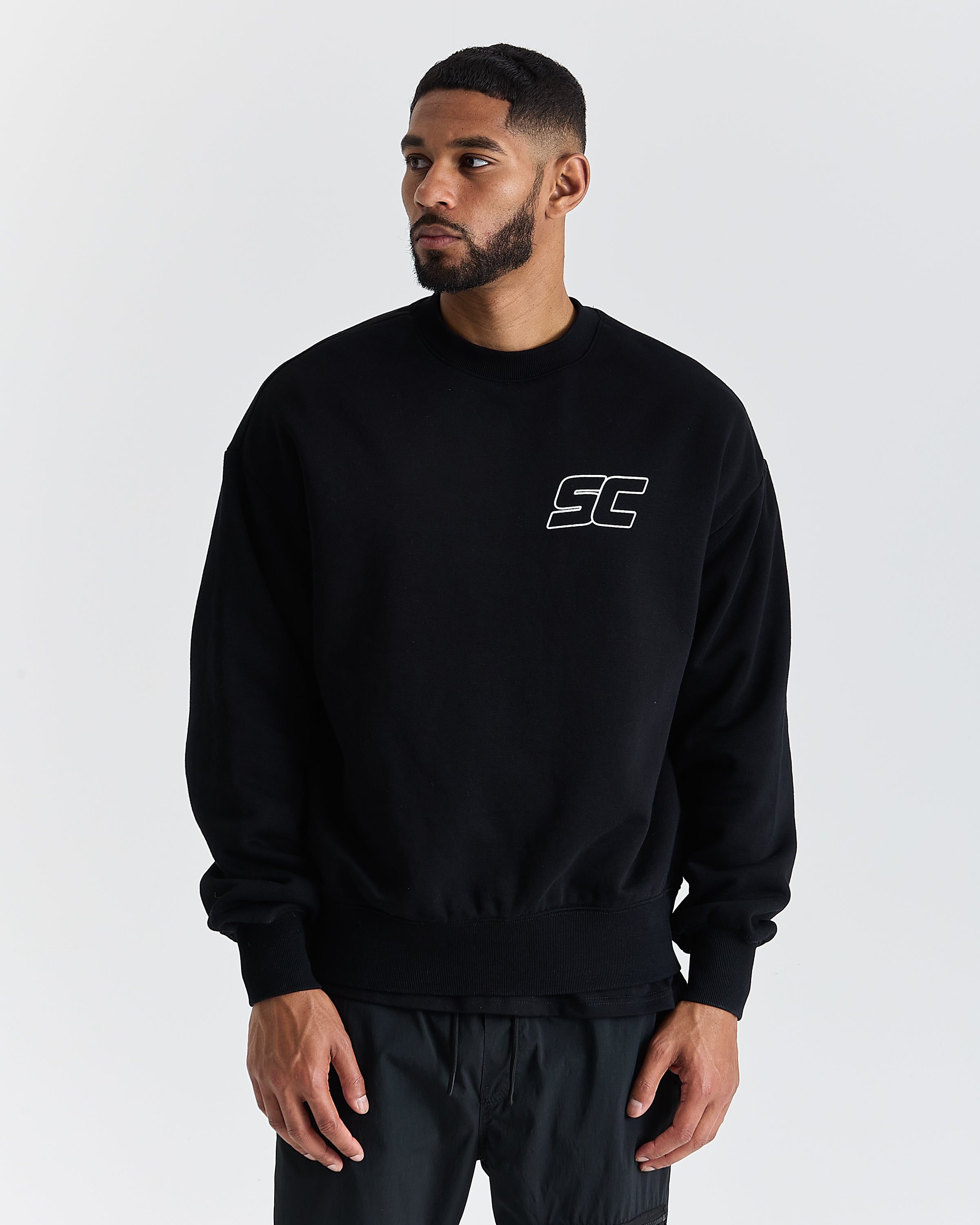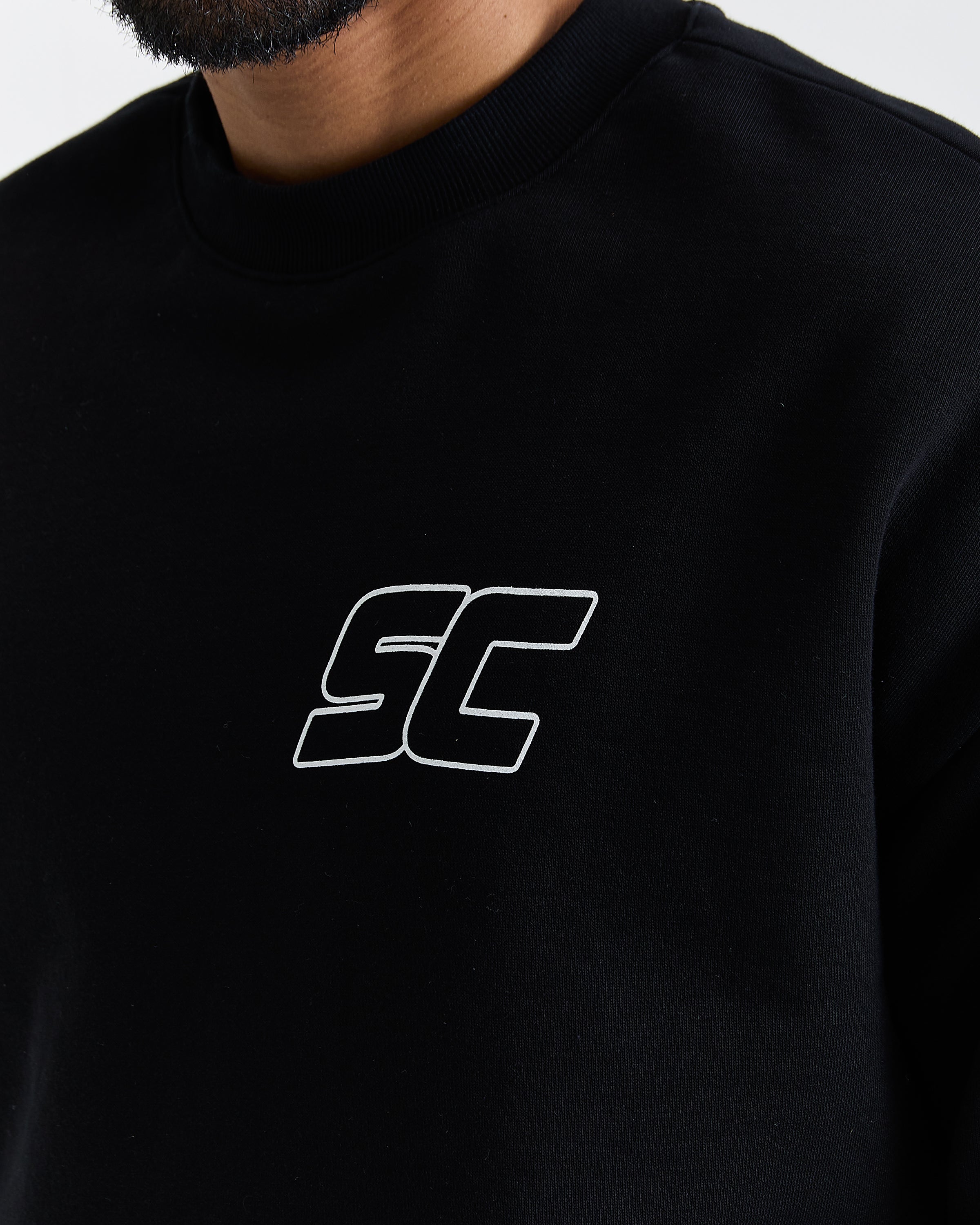 Long sleeve sweater in black. Slight oversized fit in medium weight cotton & polyester. Ribbed crewneck collar. SC graphic on the front.